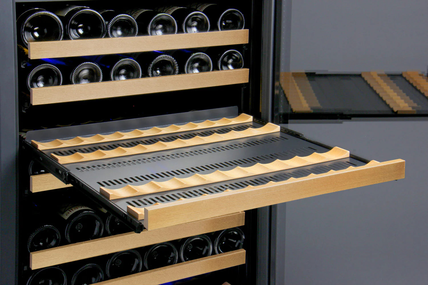Allavino's exclusive FlexCount wine racking technology cradles bottles and is designed with vibration-reduction technology to protect aging wines. This unique shelving design allows for ultimate flexibility and versatility when it comes to storing a variety of bottle sizes and shapes. Easy gliding shelves allow for easy access to your collection without disrupting the delicate wine maturation process.