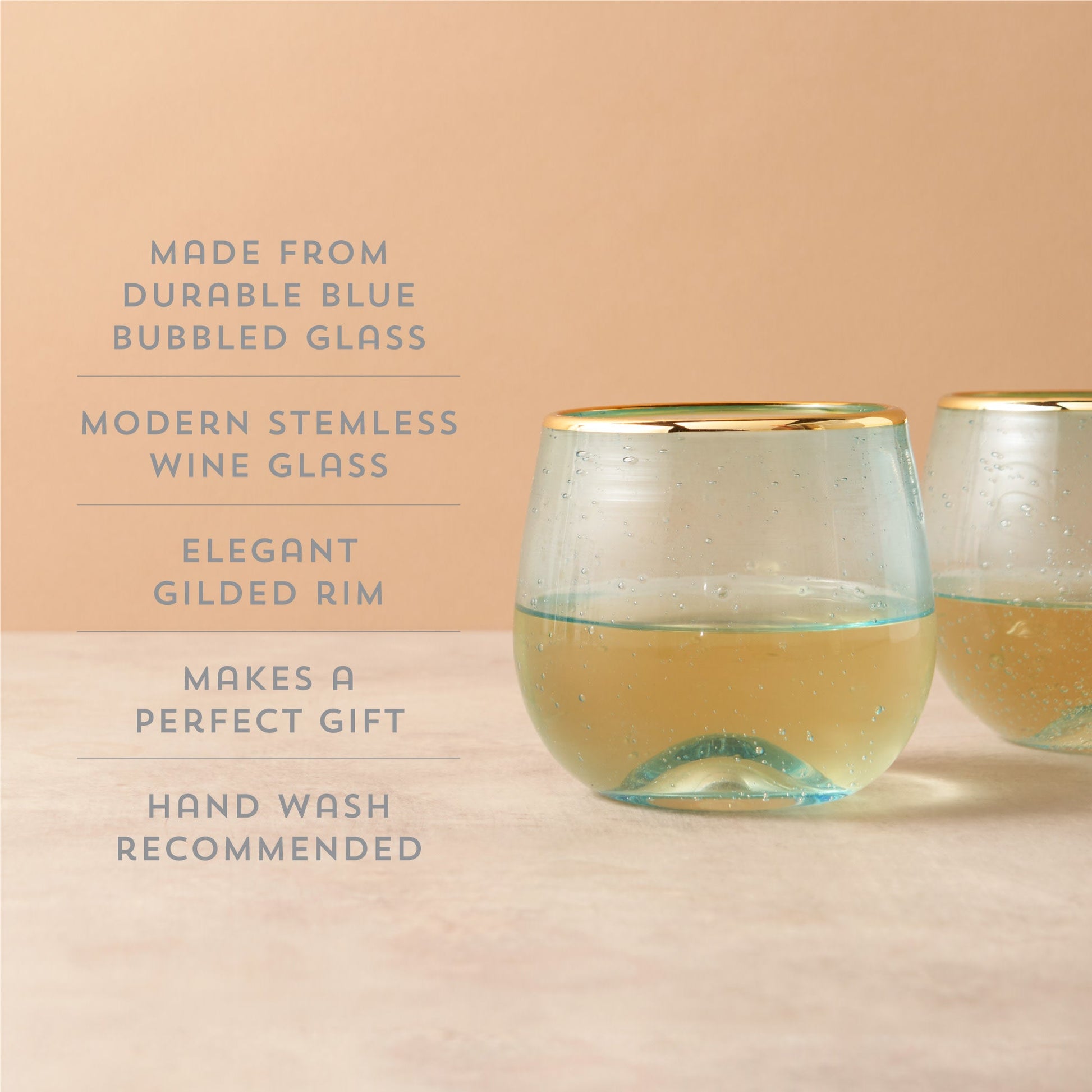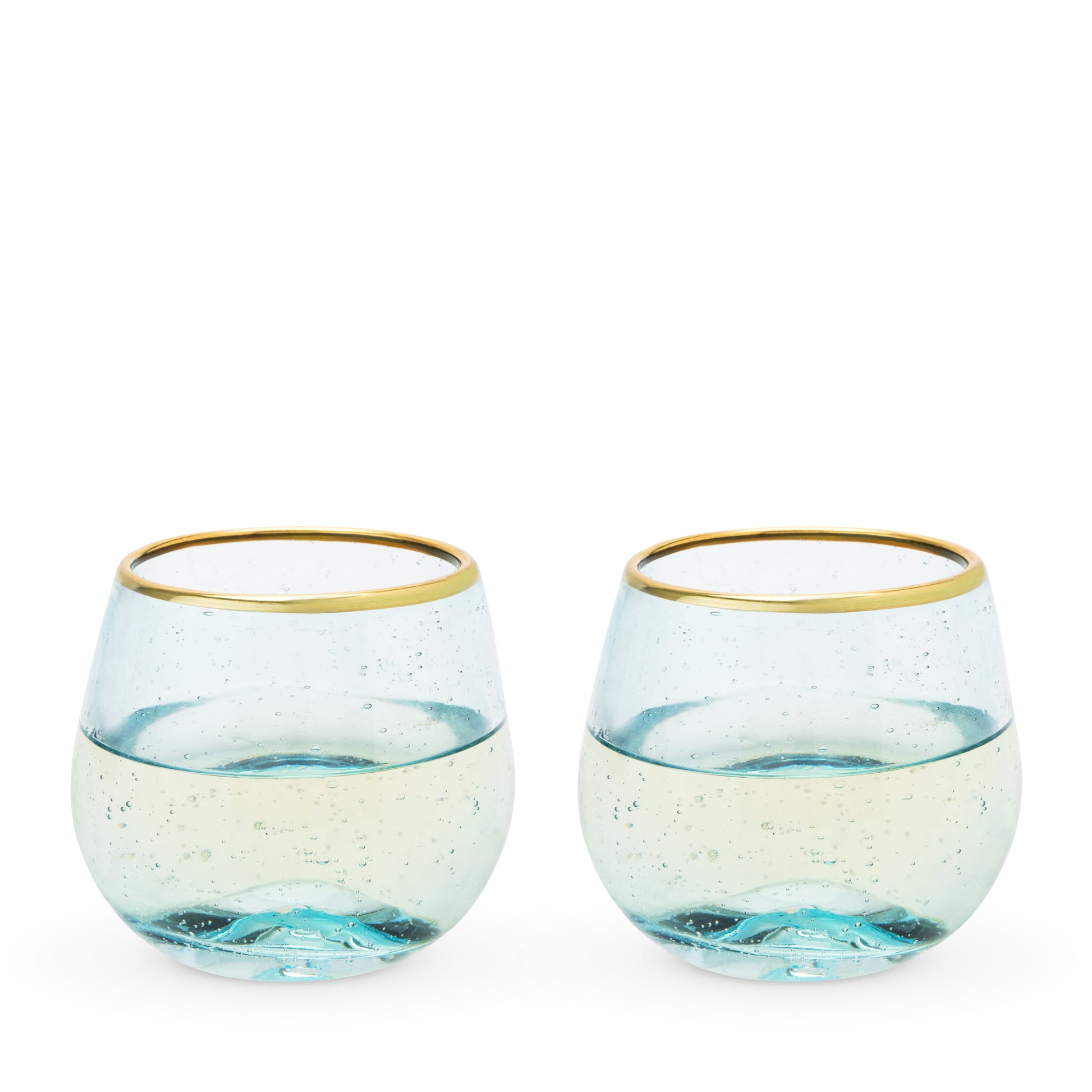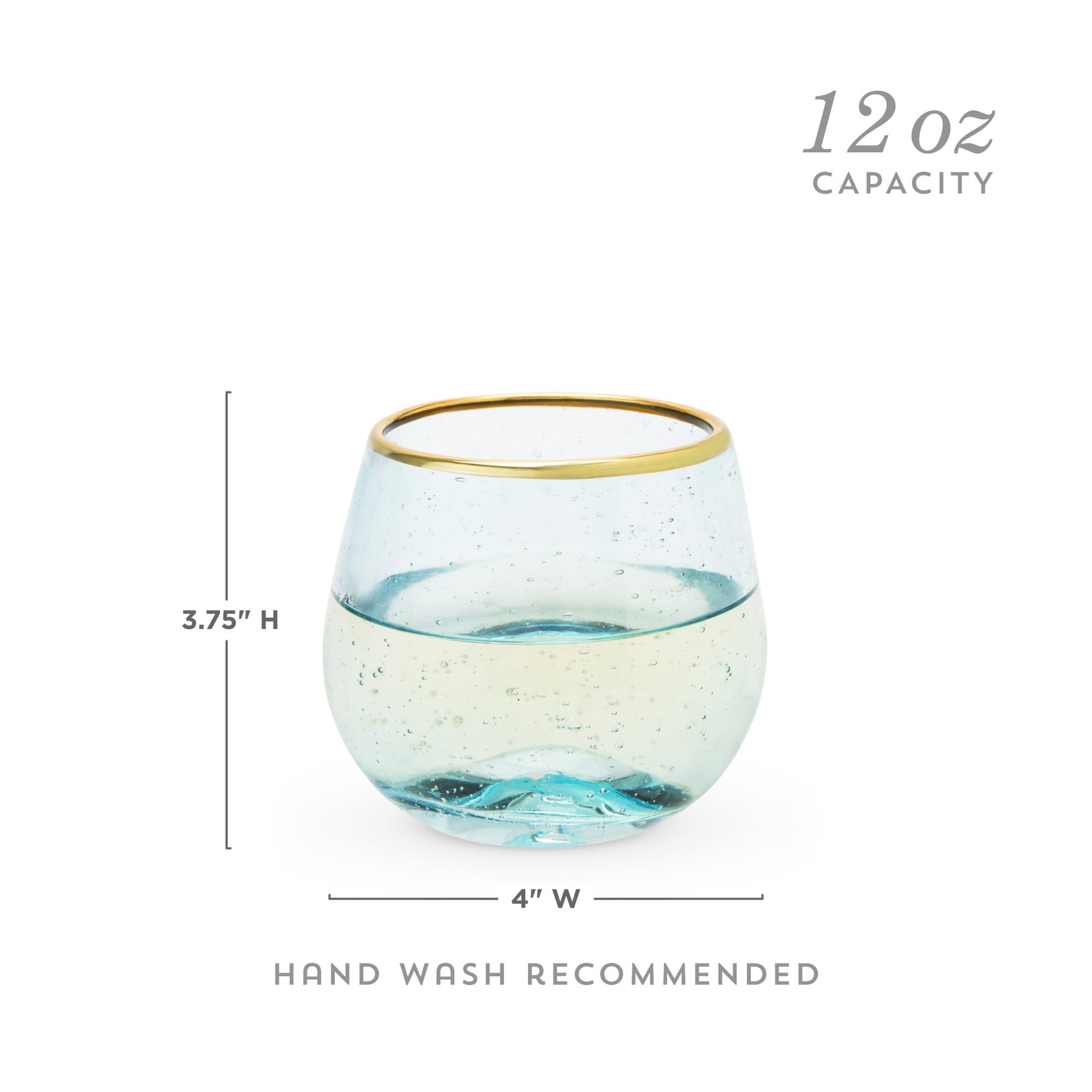 A series of delicate bubbles sit suspended in aqua-tinted glass while a laurel of gleaming gold plating adorns the rim, adding a vestige of intrigue to an already stunning set of glassware. Designed to contain 12 ounces comfortably, each wine glass is impeccably suited to accommodate any of your favorite mixed beverages.