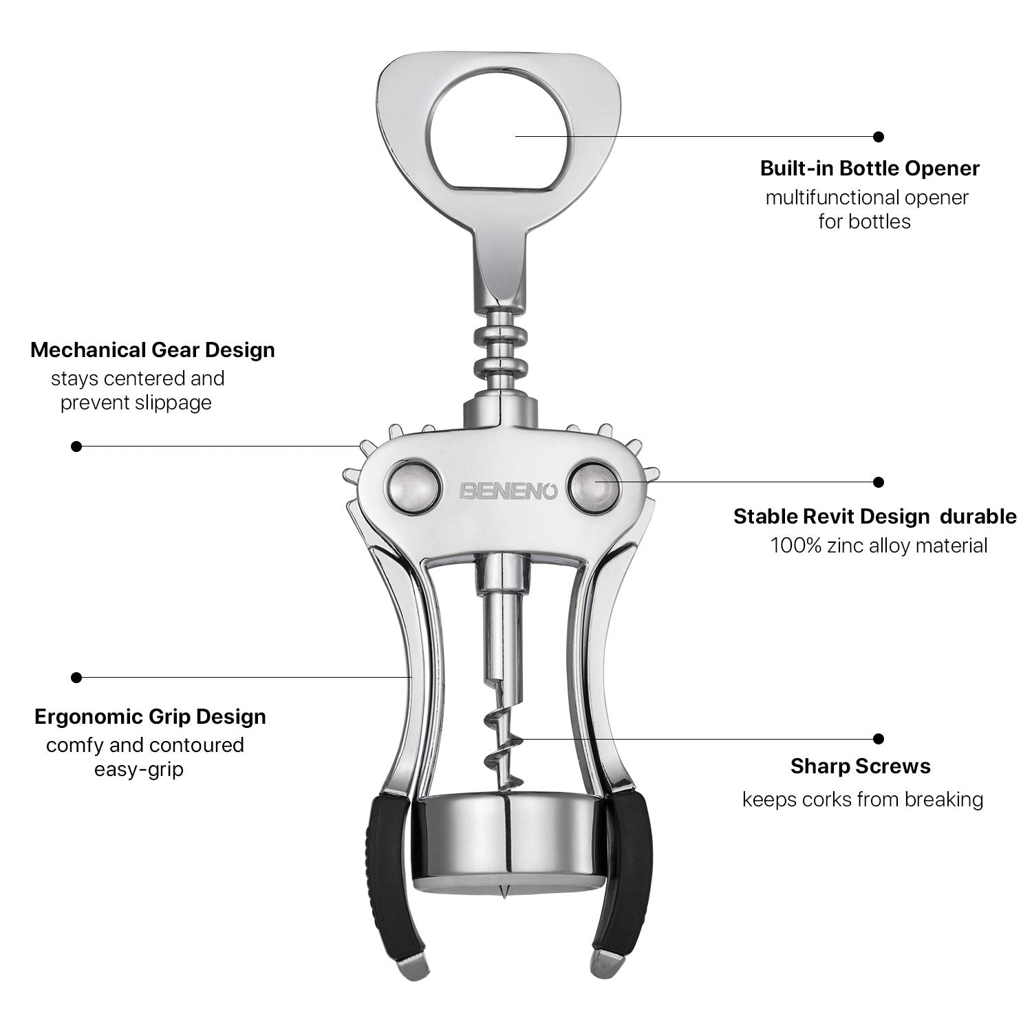 Beneno Wine Opener, Zinc Alloy Premium Wing Corkscrew with Multifunctional Bottles Opener, Sharp Wine Corkscrew with Ergonomic Non-Slip Wing Handle, Upgrade