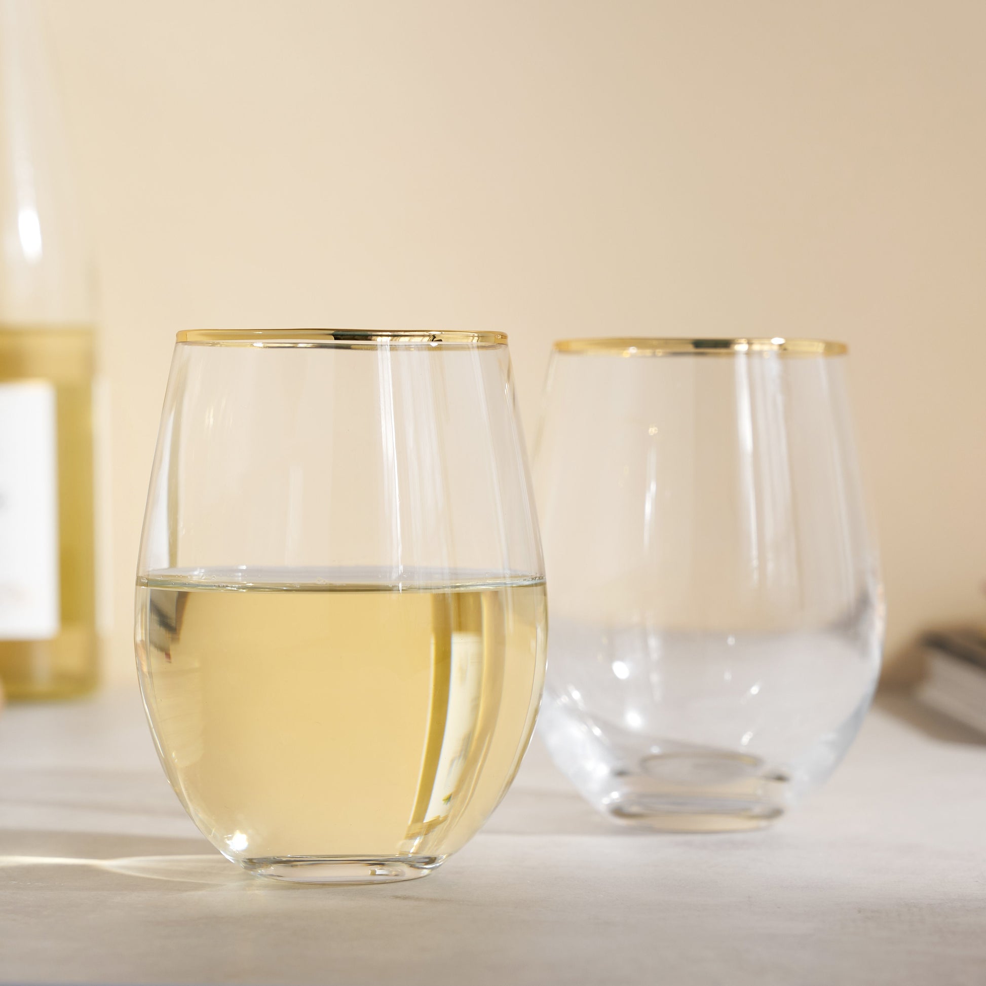 Gild your favorite vintages. With a modern stemless silhouette and dazzling gilded rim, these wine glasses add a subtle glimmer to your table. These wine glasses are perfect for any celebratory occasion or simply a quiet evening glass of wine.