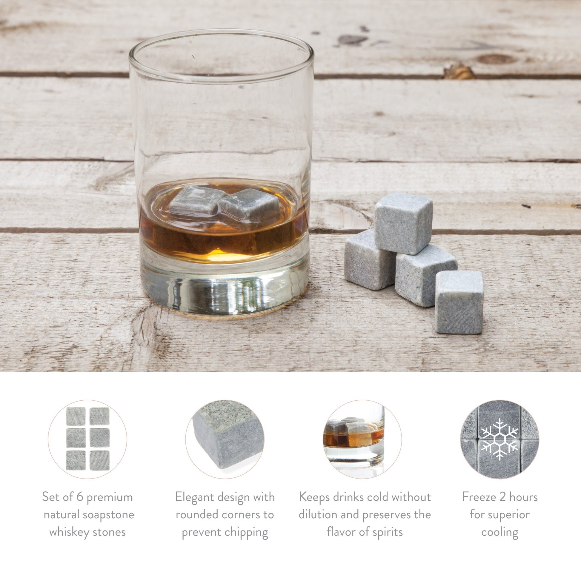 Carved from premium soapstone, our Glacier Rocks are as finely crafted as your favorite whiskey. After two hours in the freezer, they'll give your fine spirits a chill without watering them down. Rinse with hot water to clean and keep in freezer when not in use.
