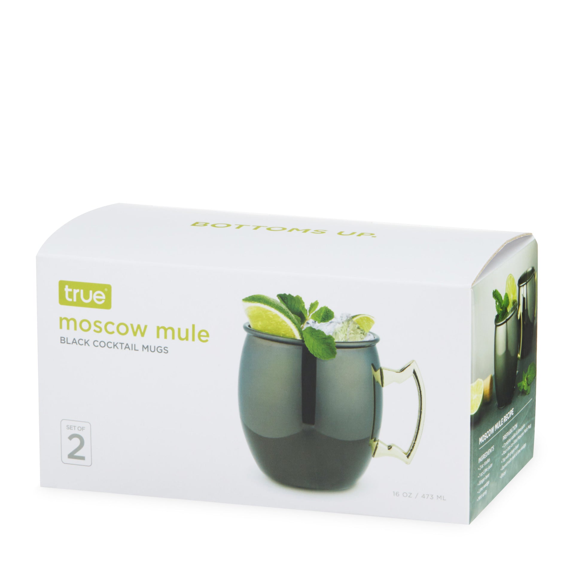 This set of two black and gold Moscow Mule mugs is a chic update to a classic. Crafted from restaurant-grade stainless steel, each mug features a polished black finish with an elegant golden zig-zag handle, perfect for serving Moscow Mules or any of your favorite cocktails. The generous 16-ounce capacity makes them ideal for entertaining.