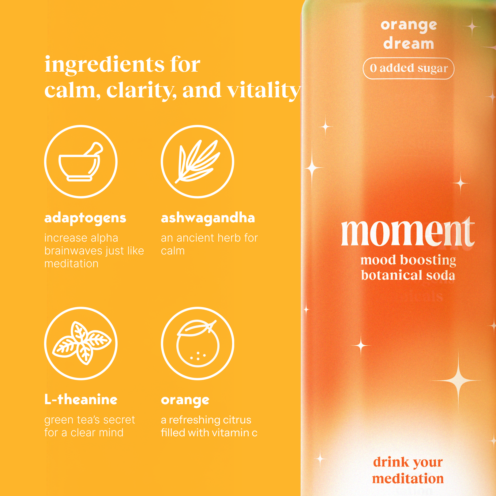 Orange dream blends bright citrus with dreamy calm. It’s the fizzy, feel-good soda you crave, but with zero added sugar and calming, mood-boosting botanicals. It's sparkling, feel-good, and totally crash-free.