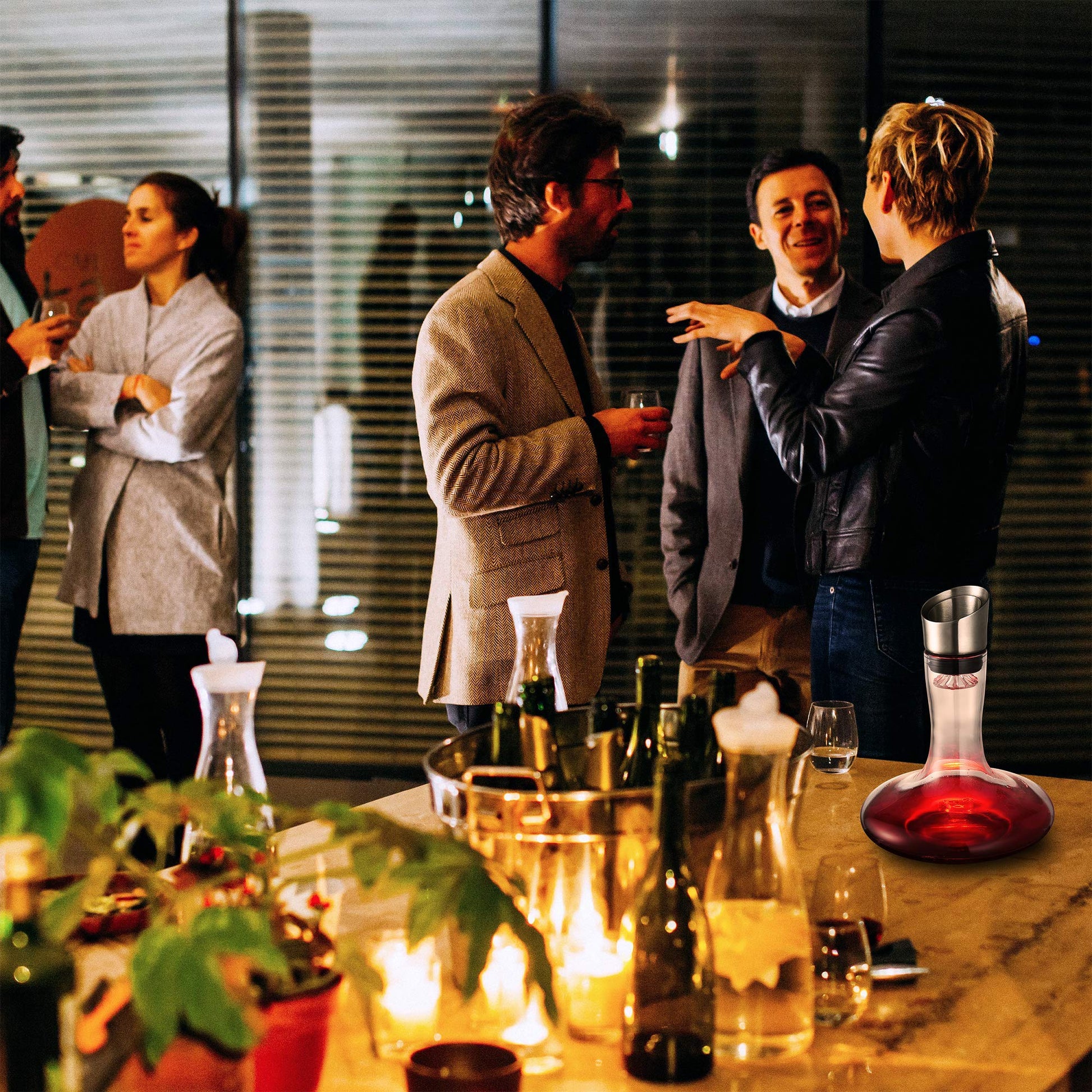 - WINE CARAFE BUILT-IN AERATOR : It is different from the traditional decanter , our decanter have the double-layer filter , it will help to filter out impurities and aerate the red wine , you only need to wait for about 3-5 minutes when using this product, avoid the longer waiting time . Decanting the wine from the bottle to the decanter aerate the wine and releases its rich aroma and flavor.
